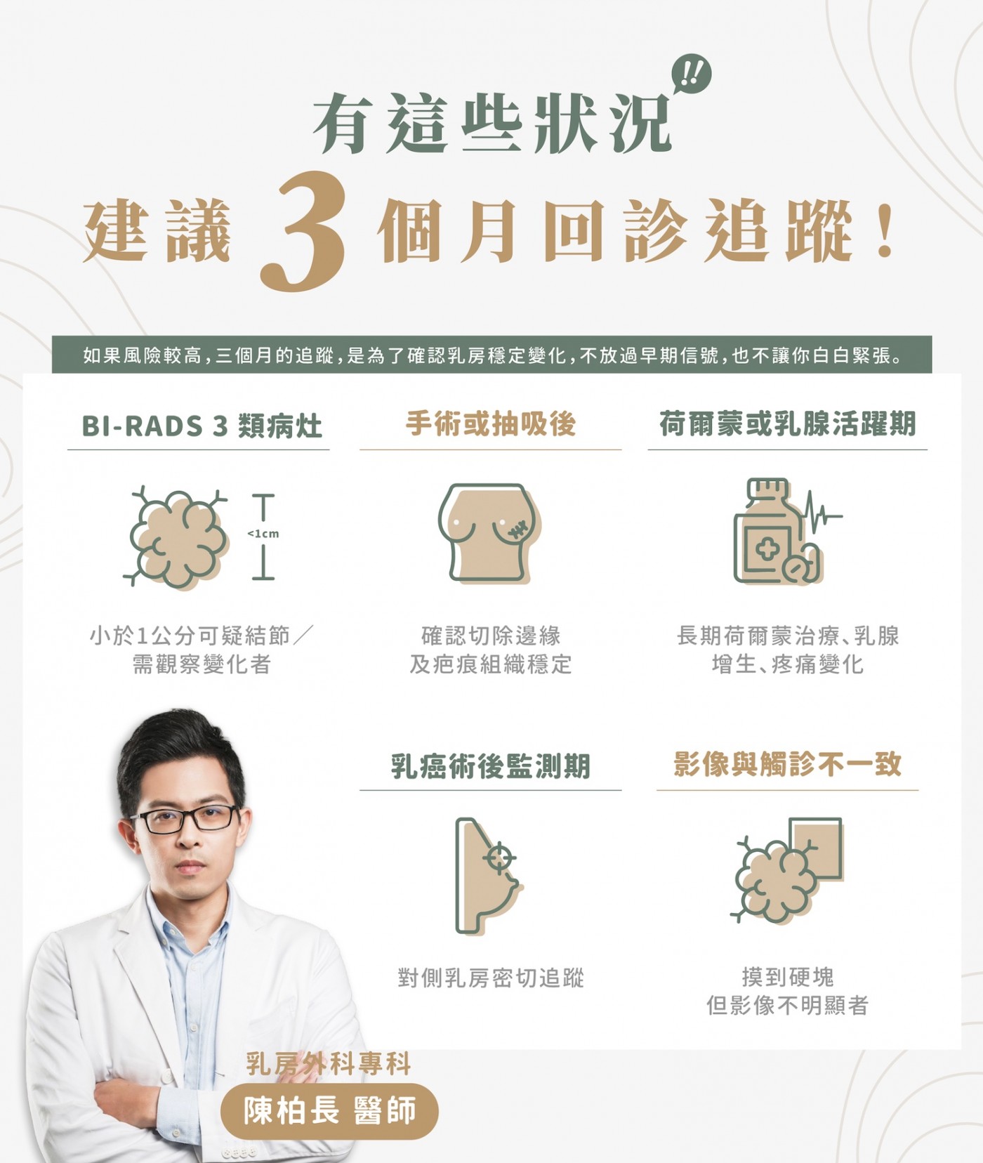 不是每個人都能等半年或一年。某些乳房影像或臨床狀況需要 短期密切觀察: