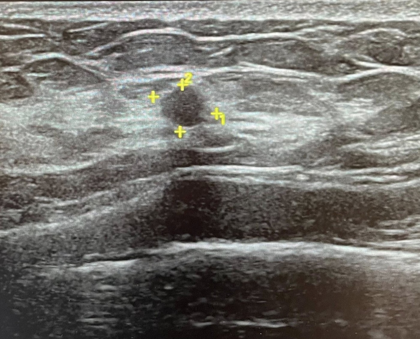 這位患者半年前在外院做乳房超音波,發現一顆 0.3 公分的小腫瘤。