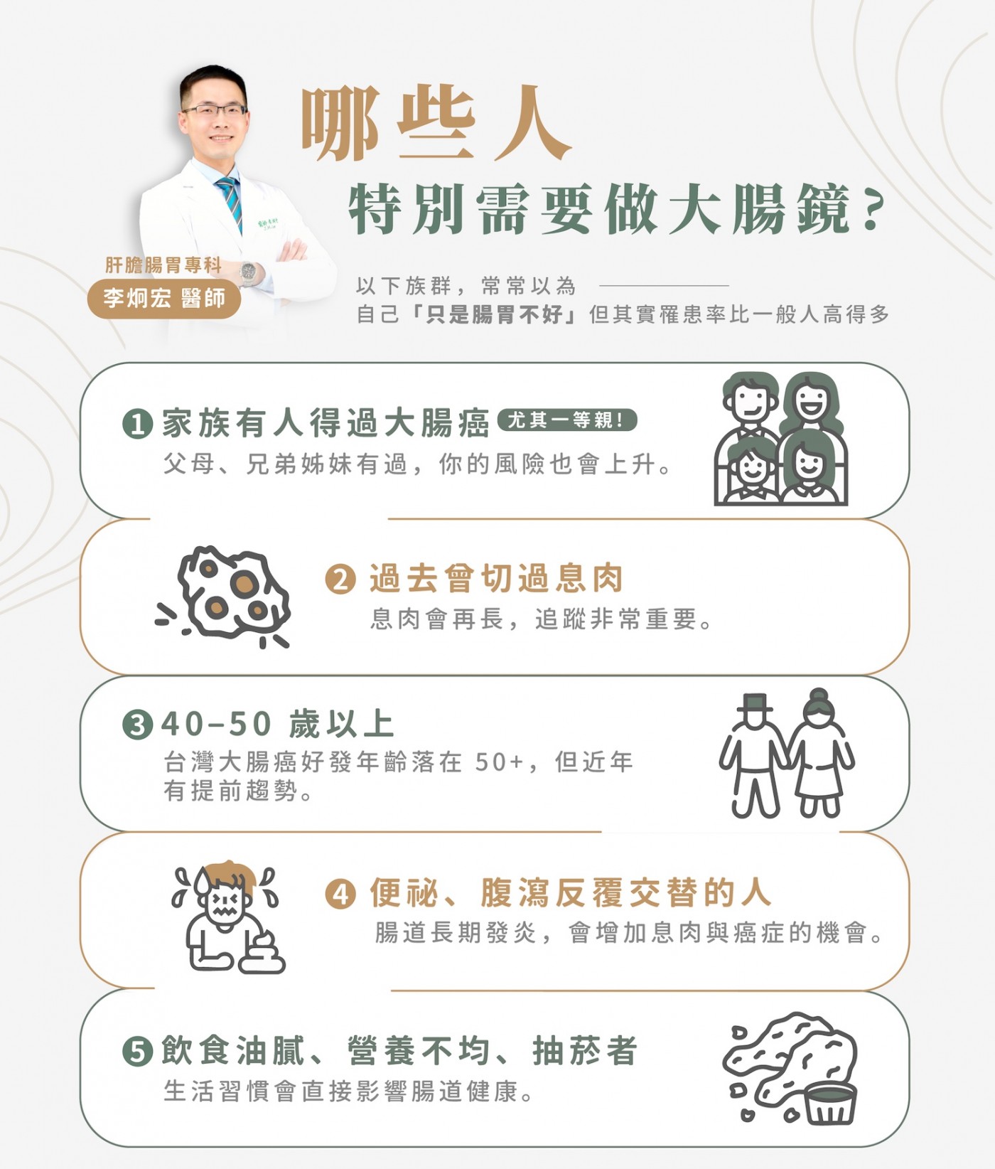 李炯宏醫師提醒,以下五大族群的大腸癌風險遠高於一般人:
