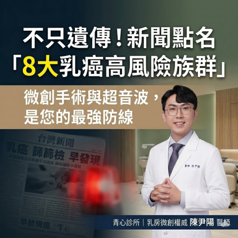 不只遺傳!新聞點名「8大乳癌高風險族群」,陳尹陽醫師:微創手術與超音波是您的最強防線 這次女星確診的新聞,最讓人震驚的就是「無家族史」。許多女性驚覺,原來自己一直身處高危險群而不自知。新聞中醫師特...