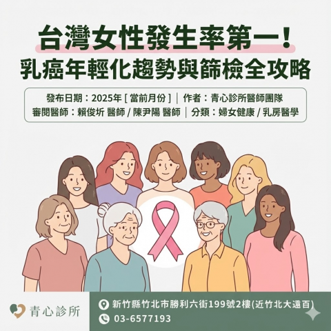 【婦女健康】台灣女性發生率第一!乳癌年輕化趨勢與篩檢說明 乳癌,是台灣女性發生率最高的癌症。與歐美國家多發生在停經後不同,台灣乳癌患者的發病年齡高峰落在 45-55 歲,甚至有不少 30 多歲的年輕案例。 青...