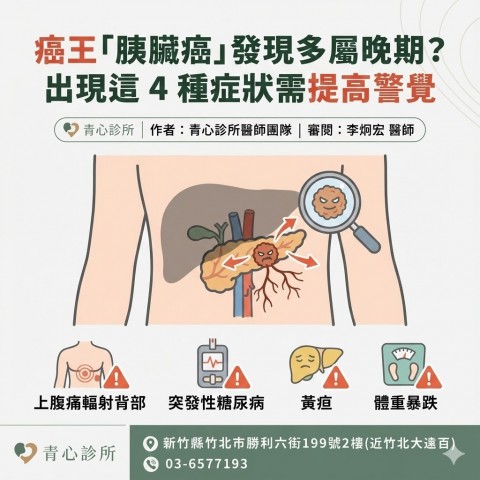 癌王「胰臟癌」發現多屬晚期?出現這 4 種症狀需提高警覺 胰臟癌雖然在發生率排名第十,但在「癌症死亡率」排行榜上常年居高不下,且五年存活率低於 10%,被醫界公認為「癌王」。 青心診所胃腸肝膽科主治醫師 ...